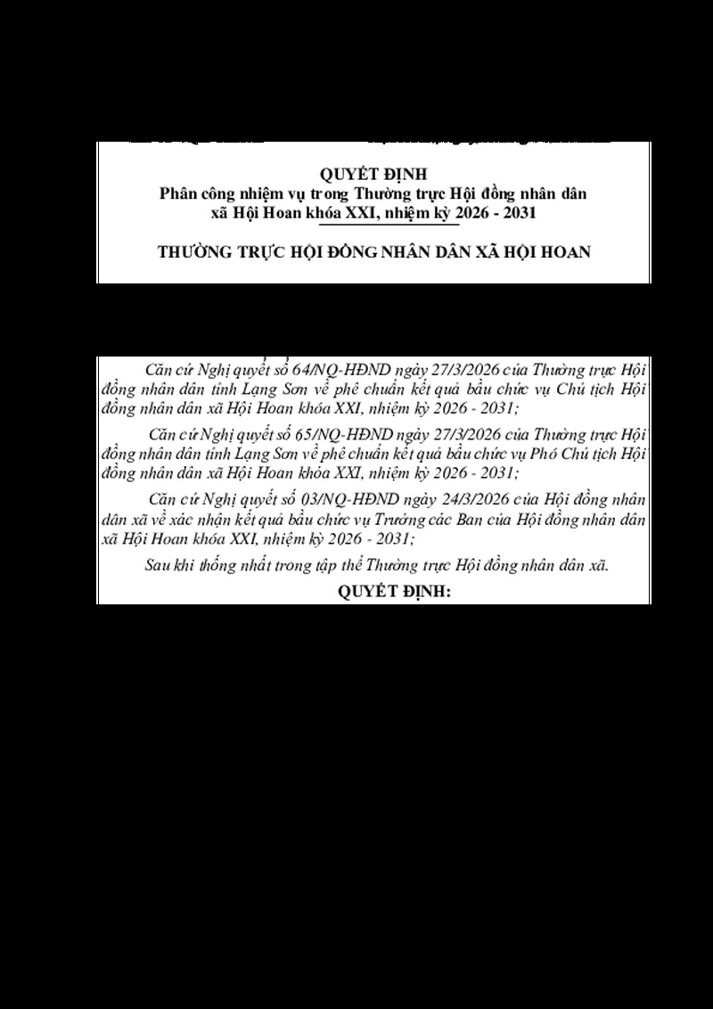| Tiêu đề văn bản | Quyết định phân công nhiệm vụ trong Thường trực Hội đồng nhân dân xã Hội Hoan khóa XXI, nhiệm kỳ 2026 - 2031 | ||
