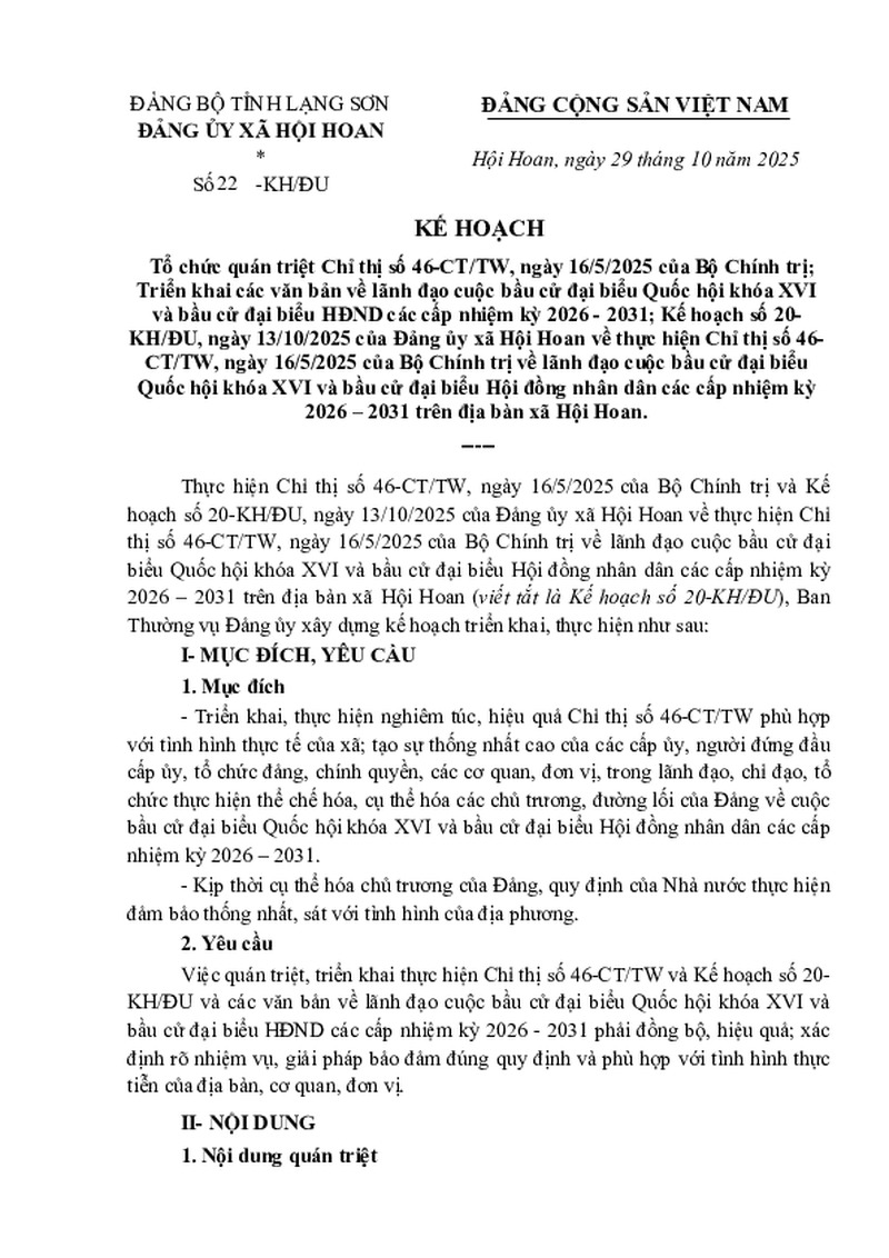 | Tiêu đề văn bản | Kế hoạch Tổ chức quán triệt Chỉ thị số 46-CT/TW, ngày 16/5/2025 của Bộ Chính trị; Triển khai các văn bản về lãnh đạo cuộc bầu cử đại biểu Quốc hội khóa XVI và bầu cử đại biểu HĐND các cấp nhiệm kỳ 2026 - 2031 | ||