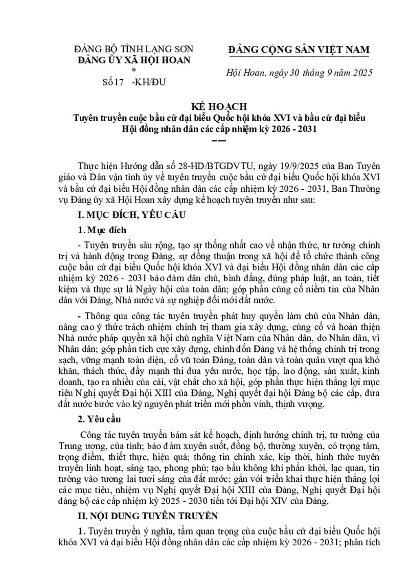 | Tiêu đề văn bản | Kế hoạch Tuyên truyền cuộc bầu cử đại biểu Quốc hội khóa XVI và bầu cử đại biểu Hội đồng nhân dân các cấp nhiệm kỳ 2026 - 2031 | ||