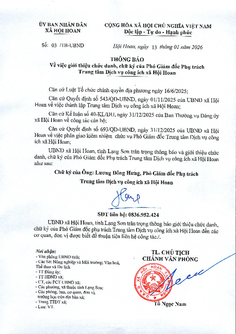 | Tiêu đề văn bản | Thông báo về việc giới thiệu chức danh, chữ ký của Phó Giám đốc Phụ trách Trung tâm dịch vụ công ích xã Hội Hoan | ||